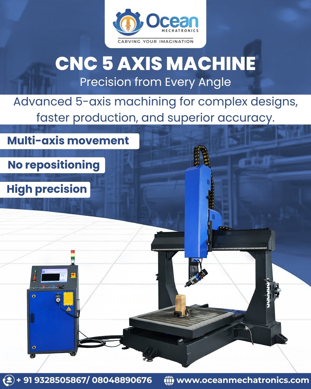 Ocean Mechatronics is a leading CNC 5 Axis Machines Manufacturer in Ahmedabad, offering advanced machining solutions for industries requiring high precision and efficiency. Our 5-axis CNC machines enable simultaneous movement along three linear and two rotary axes, enabling the production of complex geometries in a single setup. This “done-in-one” capability reduces setup time, minimizes part handling, and ensures superior accuracy and surface finishes.