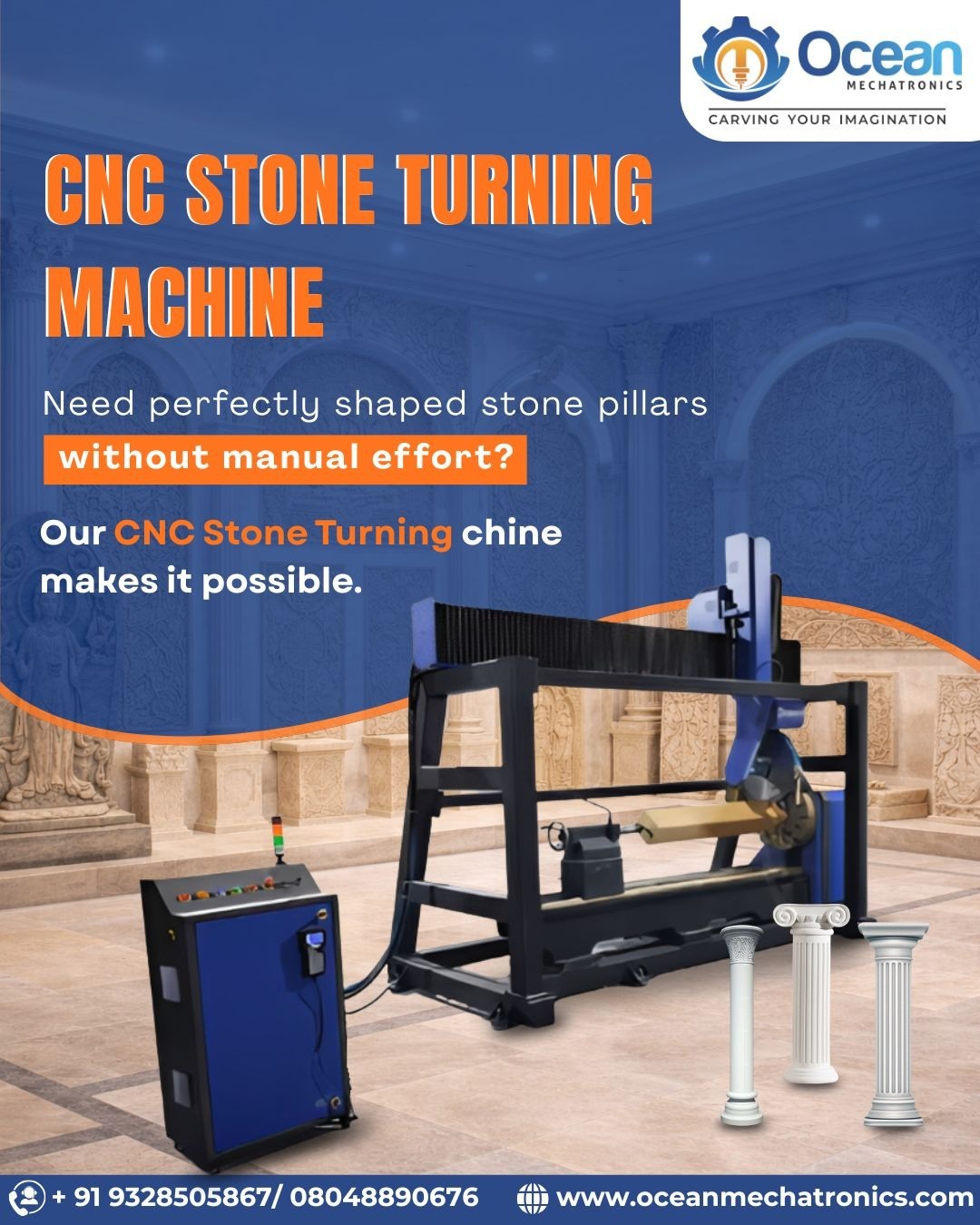 Ocean Mechatronics, based in Ahmedabad, is a leading CNC Stone Turning Machine Manufacturer in India, specializing in high-precision, computer-controlled machines for stone carving, engraving, and polishing. Engineered for both 4-axis and 5-axis operations, these machines allow artisans and manufacturers to create cylindrical, curved, and intricate 3D designs with remarkable accuracy and repeatability.